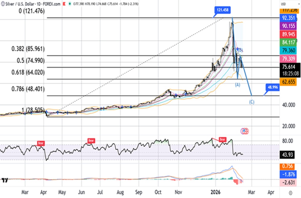 Silver tracked gold’s volatility but continued to underperform structurally, remaining in a corrective phase after January’s extreme surge. The metal rebounded nearly 3% on softer inflation data and firmer rate-cut expectations, briefly moving back above $76 per ounce, but gains faded as liquidity stayed thin amid China holidays and broader risk sentiment remained fragile. Heavy speculative positioning left silver exposed to sharp reversals, and prices are still far below late-January highs above $120 after the collapse toward the mid-$60s. While lower yields and debasement concerns offer underlying support, near-term trade points to consolidation rather than a swift return to the prior rally.