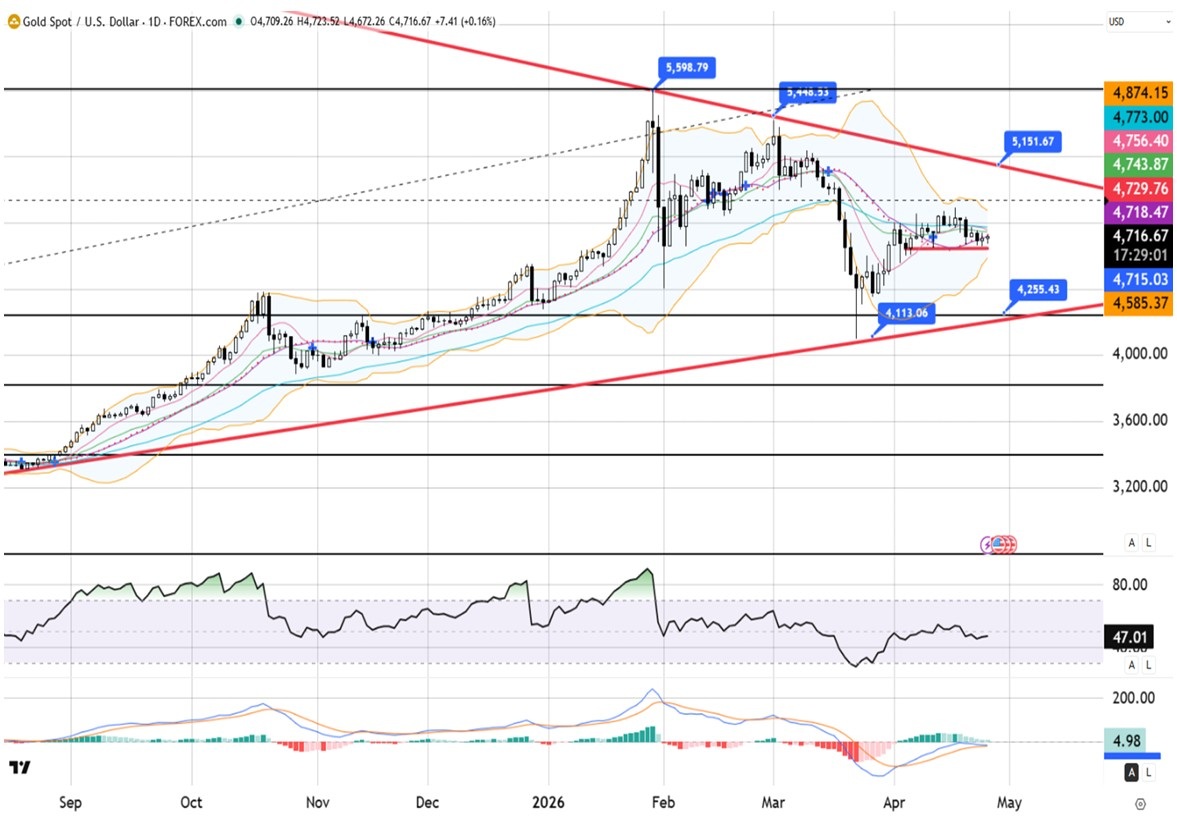 Teaser: Gold rose mildly after the Justice Department dropped its probe into outgoing Fed Chair Jerome Powell, supporting both gold and silver futures. The development opens the door for Kevin Warsh to succeed Powell, prompting expectations of lower interest rates sooner rather than later. On Friday, gold attempted a rebound, climbing above $4,700/troy ounce as cautious optimism emerged around potential progress in US-Iran peace talks. Latest developments on 24th April indicated a possible meeting between US and Iran over ending the near two-month war, which weighed on crude oil. The meeting was cancelled last minute, and both sides in a naval standoff assumed aggressive posture attacking ships passing through strait of Hormuz. This supported crude oil prices. While doubts remain and recent talks have delivered limited progress, the continued blockage of the Strait of Hormuz has kept energy prices elevated. As a result, gold remains on track for a weekly loss of over 2%, with non-yielding bullion under pressure from rising inflation concerns and expectations of tighter monetary policy. We expect volatility to persist in bullion and energy markets pending any new developments in the US-Iran war.