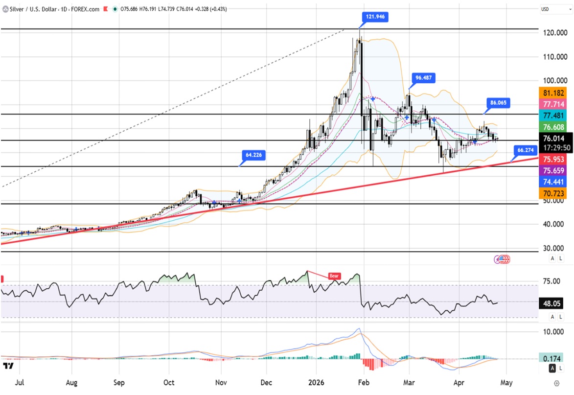 Silver traded below $76 an ounce on Monday, holding losses from last week as attempts to revive US–Iran peace negotiations faltered and the Strait of Hormuz remained effectively closed, heightening concerns over persistent inflationary pressures. US President Donald Trump cancelled a planned trip by top envoys to resume talks with Iran in Islamabad, while Tehran reiterated it would not engage in negotiations under threats or blockade. Meanwhile, oil prices rallied as the Middle East conflict entered its ninth week, triggering what the IEA has characterized as the largest energy supply shock on record. Elevated inflation risks have strengthened expectations that central banks may keep interest rates higher for longer or even tighten further, weighing on non-yielding precious metals. The US Federal Reserve is also expected to proceed cautiously, with gradual rate cuts anticipated under incoming Chair Kevin Warsh.