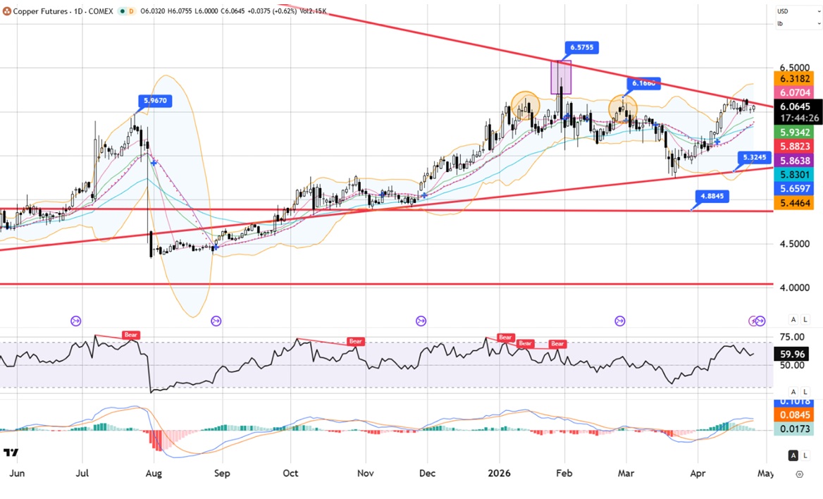 Copper futures slipped back toward $6 per pound on Friday after reaching near two month highs in the prior session, as stalled US-Iran peace efforts and continued disruption in the Strait of Hormuz kept energy prices elevated and inflation risks in focus. Tehran continues to maintain control of the strategic waterway and has reportedly fired on commercial vessels this week, while the US blockade of Iranian ports remains in place, sustaining pressure on the Islamic Republic. Copper and other industrial metals have faced headwinds from inflation concerns that could prompt tighter monetary policy, alongside growth risks that may soften global industrial demand. Still, downside ressure has been partially cushioned by restocking activity in China ahead of the Labor Day holiday from May 1 to 5. Official data also showed Chinese smelters produced a record 1.33 million tons of refined copper in March.